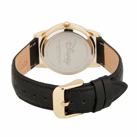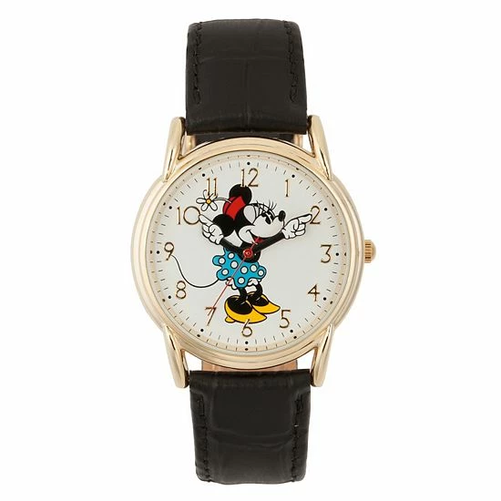 This Disney’s Minnie Mouse women’s gold tone black leather watch is a classic and charming must-have accessory. © Disney