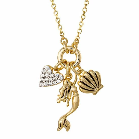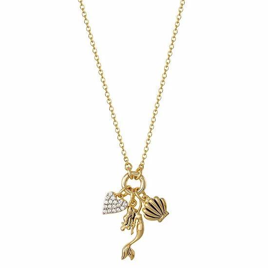 This delightful The Little Mermaid necklace features 18k gold plated mermaid, seashell, and CZ heart charms to add a touch of elegance to your everyday wardrobe.