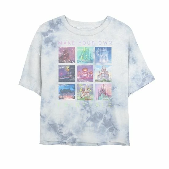 Make your look magical juniors’ Disney Castles Make Your Own Fairytale Bombard Wash Crop Graphic Tee.