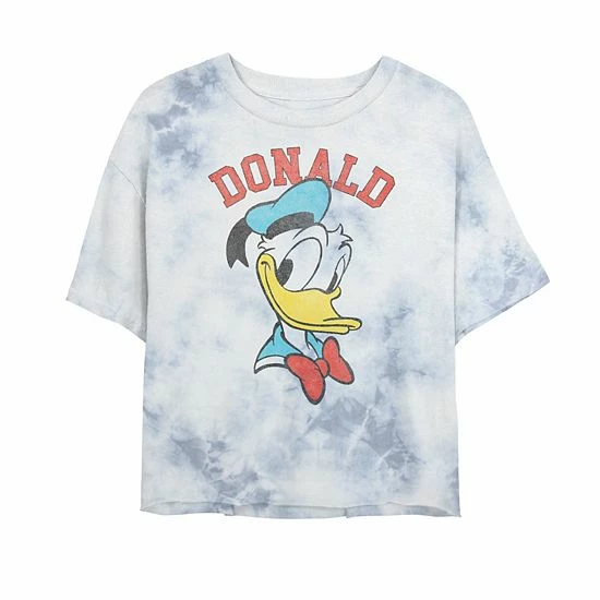 Keep smiling with this juniors’ Disney Mickey And Friends Donald Duck Happy Big Face Bombard Wash Crop Graphic Tee.