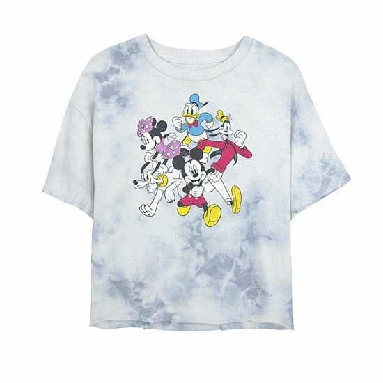 The gangs all here in this juniors’ Disney Mickey And Friends Group Shot Simple Bombard Wash Crop Graphic Tee.