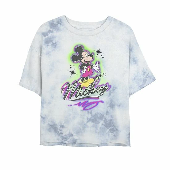 You’ll love this fun look juniors’ Disney Mickey And Friends Mickey Mouse Airbrush Portrait Bombard Wash Crop Graphic Tee.
