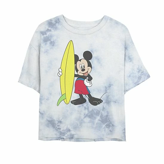 Surfs Up in this juniors’ Disney Mickey Mouse Surfer Outfit Bombard Wash Crop Graphic Tee.
