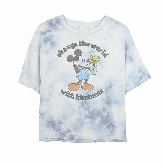 Lead by example with this juniors’ Disney Mickey With Flowers Change The World With Kindness Bombard Wash Crop Graphic Tee.