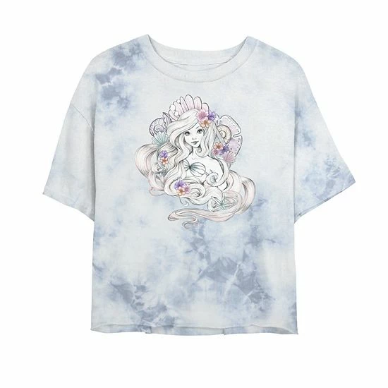 You’ll love the look of this juniors’ Disney Princess Little Mermaid Ariel Watercolor Floral Shell Bombard Wash Crop Graphic Tee.