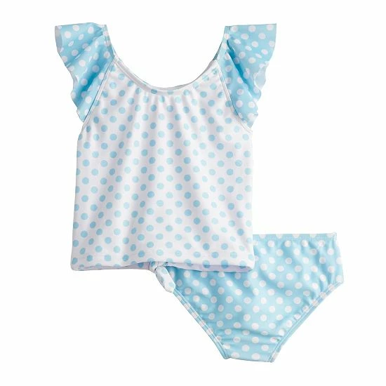 She’ll be ready for beach day fun in this toddler girls’ polka dot Minnie Mouse flutter sleeve two-piece tankini bathing suit. ©Disney