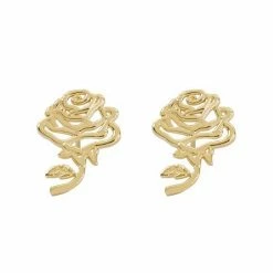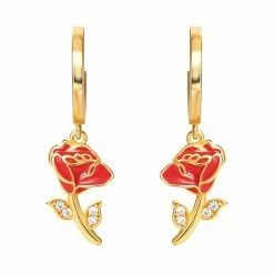 Disney’s Beauty And The Beast 18k Gold Over Silver Cubic Zirconia Enameled Rose Huggie Drop Earrings